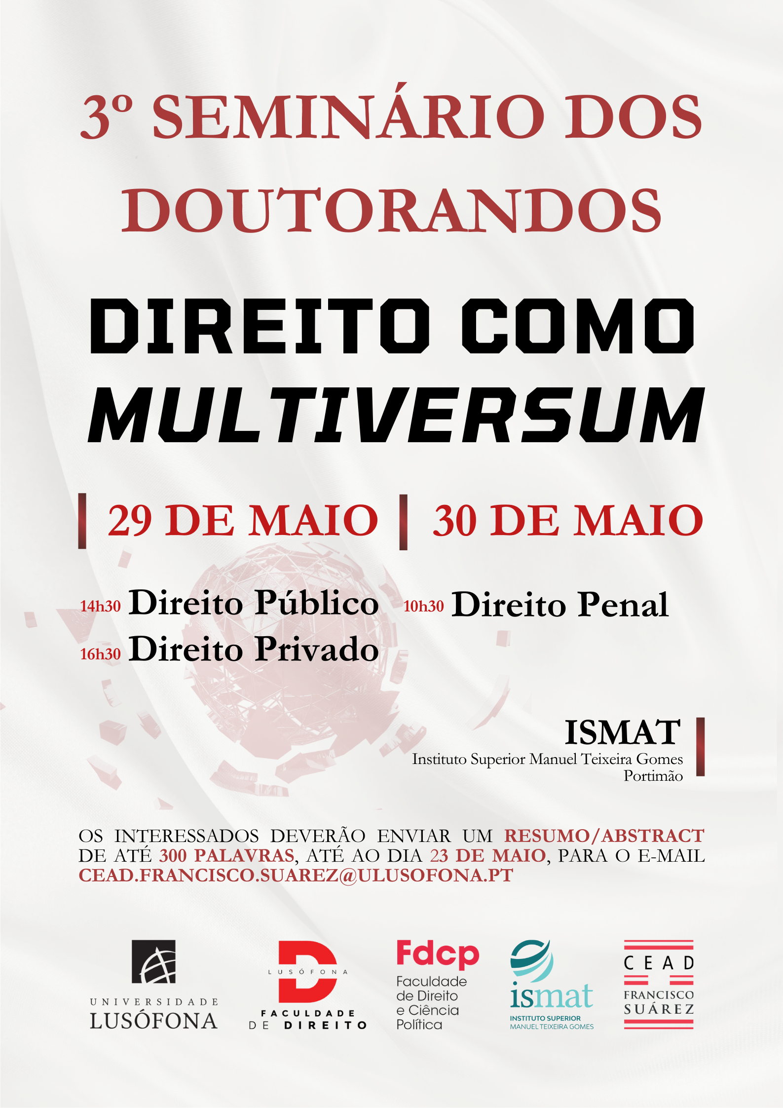 O CEAD, em parceria com a Faculdade de Direito da Universidade Lusófona - CUL, a Faculdade de Direito e Ciência Política da Universidade Lusófona - CUP e o ISMAT, convida a comunidade acadêmica e científica para o 3º Seminário dos Doutorandos – Direito como Multiversum, que terá lugar nos dias 29 e 30 de maio de 2024, no ISMAT.