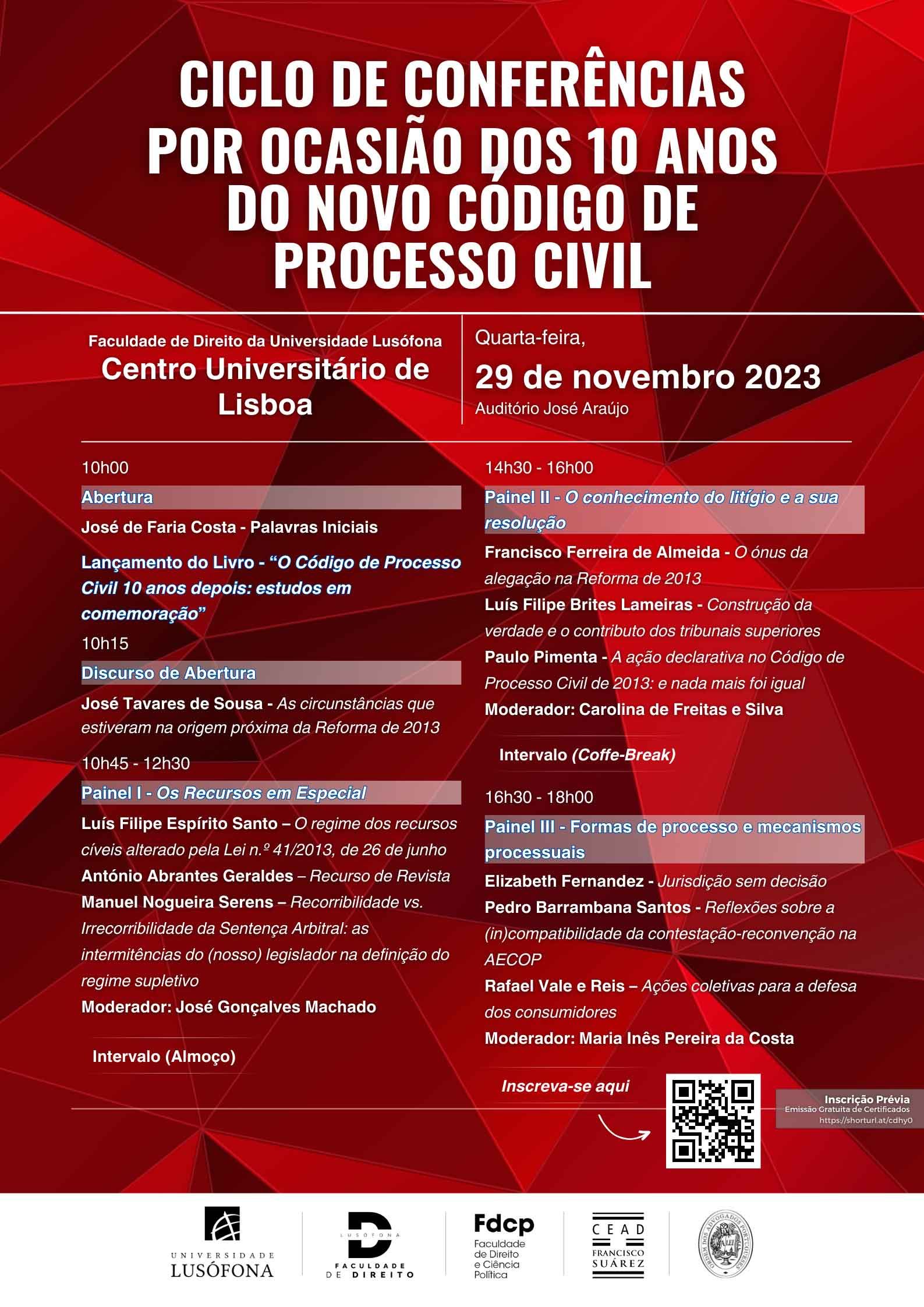 A Faculdade de Direito anuncia o Ciclo de Conferências por Ocasião dos 10 Anos do Novo Código de Processo Civil, a realizar-se dia 29 de novembro de 2023, no Centro Universitário de Lisboa, no Auditório José Araújo, pelas 10h00.