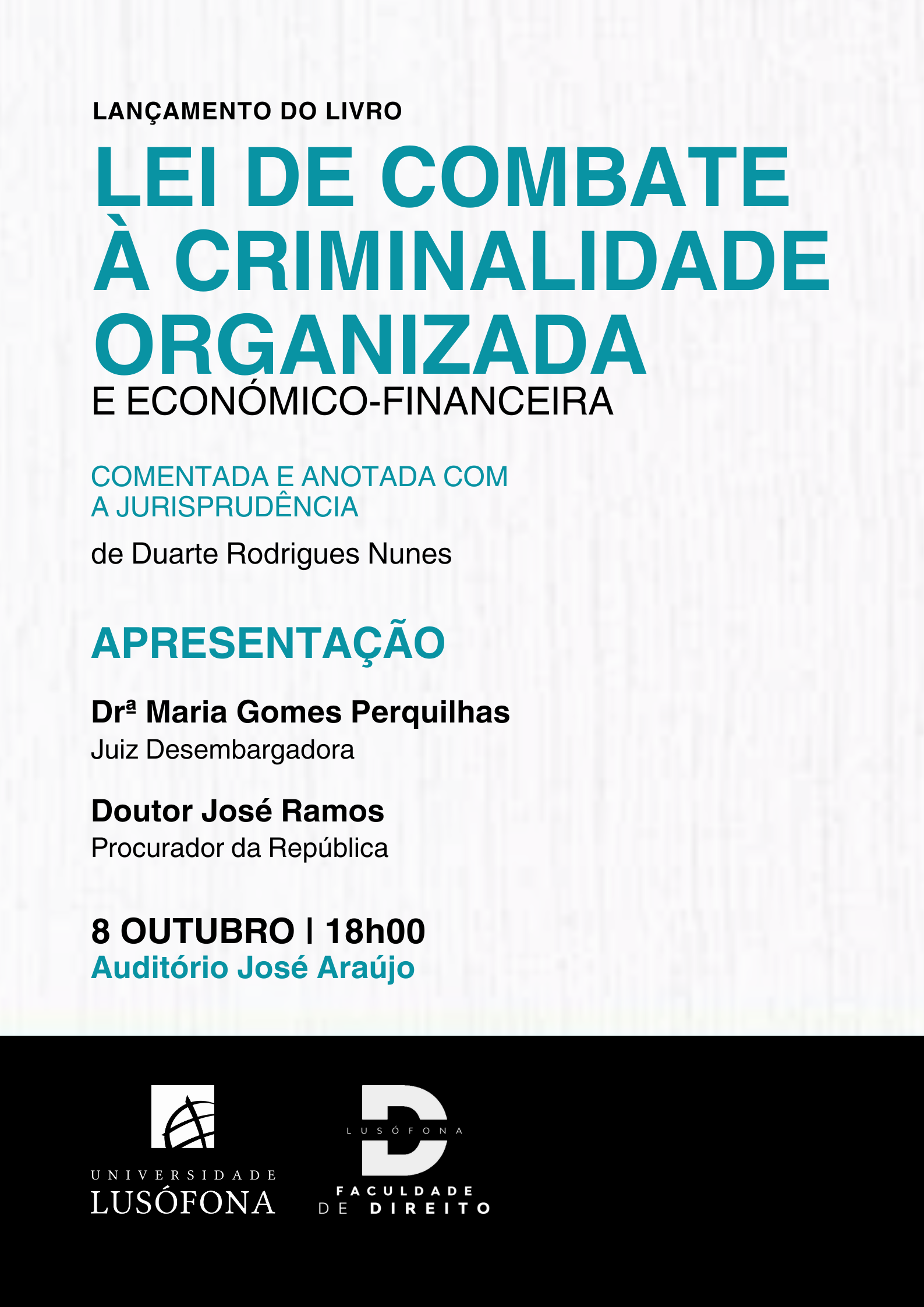 A Faculdade de Direito da Universidade Lusófona anuncia o lançamento da obra "Lei de Combate à Criminalidade Organizada e Económico-Financeira — Comentada e Anotada com a Jurisprudência", da autoria do Doutor Duarte Rodrigues Nunes.