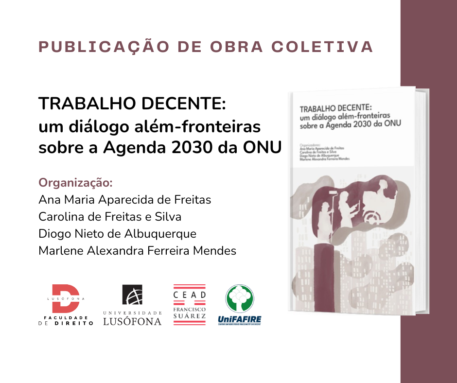 Foi publicada a obra coletiva "TRABALHO DECENTE: um diálogo além-fronteiras sobre a Agenda 2030 da ONU", que conta com a contribuição de Professores da Faculdade de Direito da Universidade Lusófona e do CEAD.