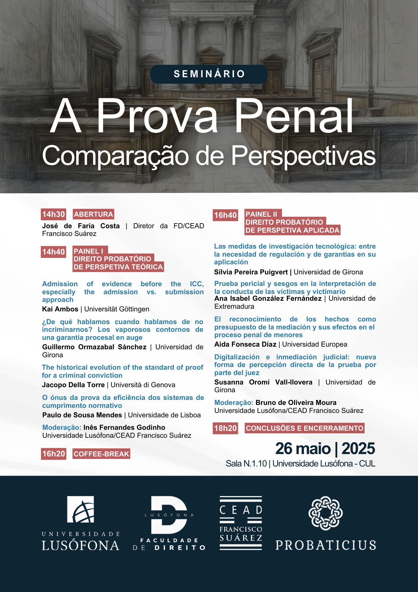 Anunciamos o Seminário "A Prova Penal - Comparação de Perspectivas", que se realizará no dia 12 de maio de 2025 na Faculdade de Direito da Universidade Lusófona - Centro Universitário de Lisboa. Este evento contará com a participação de renomados doutores internacionais e especialistas na área do Direito Penal, proporcionando um espaço privilegiado para a troca de ideias e a análise crítica de diferentes sistemas jurídicos.