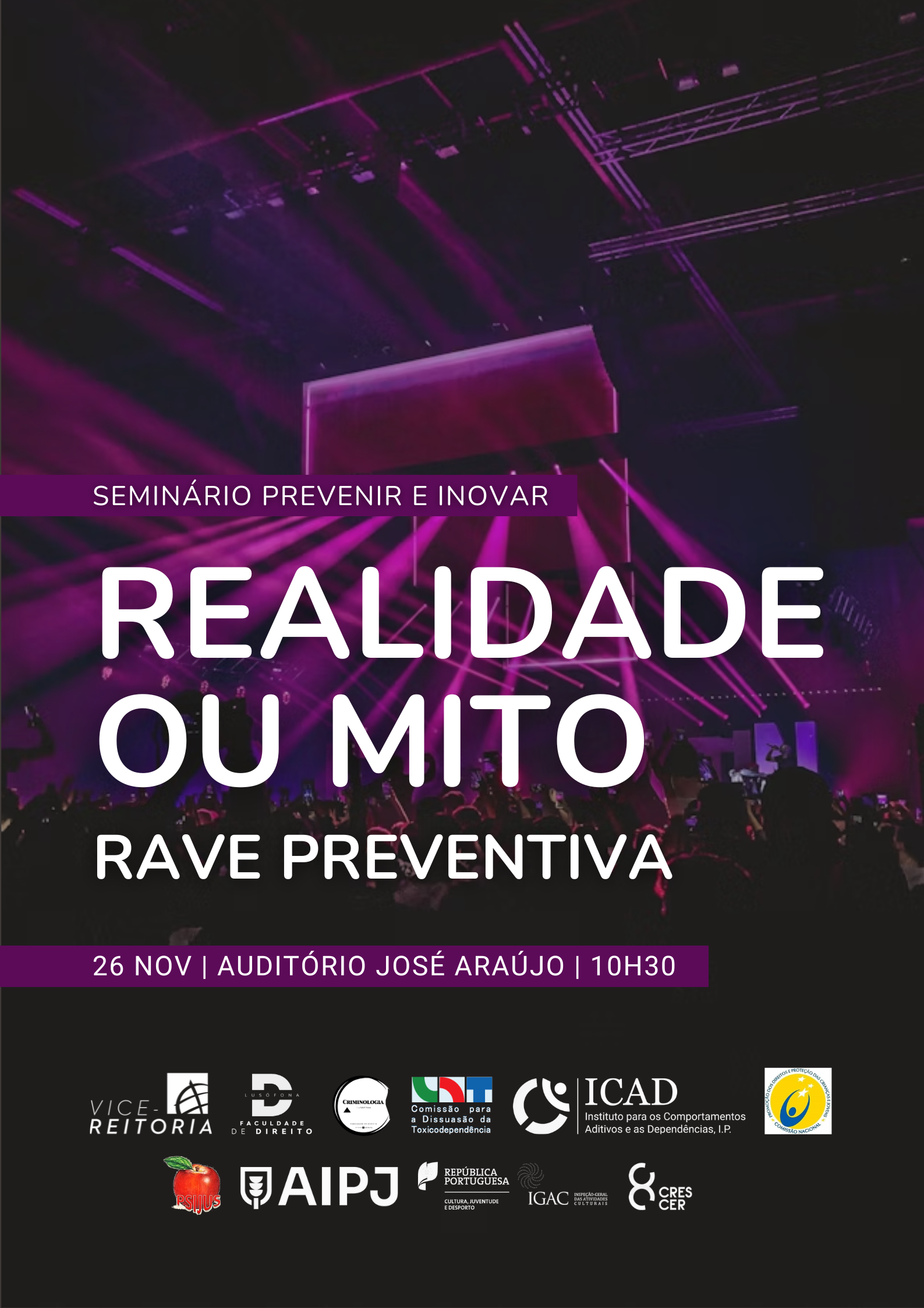 A Faculdade de Direito da Universidade Lusófona promove, no próximo dia 26 de novembro de 2025, o seminário “Prevenir e Inovar – Realidade ou Mito: Rave Preventiva”, uma iniciativa que pretende fomentar o debate interdisciplinar sobre os desafios contemporâneos da prevenção, do comportamento juvenil e das novas formas de consumo e interação social.