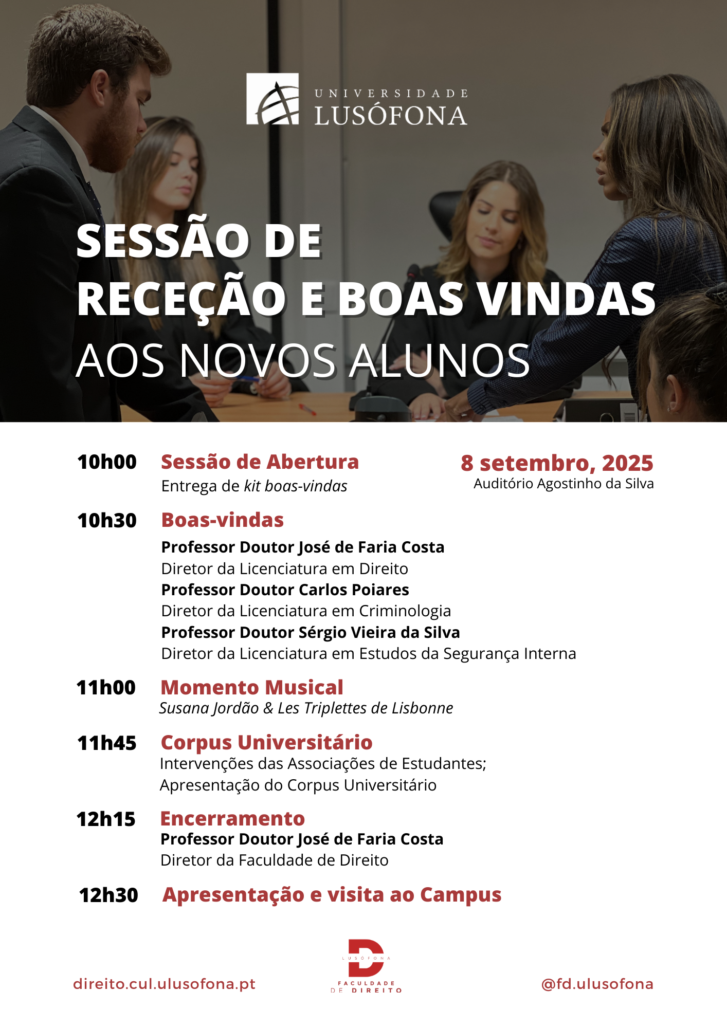 A Faculdade de Direito da Universidade Lusófona tem o prazer de receber todos os novos estudantes para o início de uma etapa única e transformadora nas suas vidas académicas.