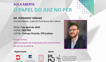 A Faculdade de Direito da Universidade Lusófona convida toda a comunidade académica e o público interessado a assistir à Aula Aberta "O Papel do Juiz no PER", que se realiza no dia 7 de abril de 2025, entre as 18h00 e as 19h00.